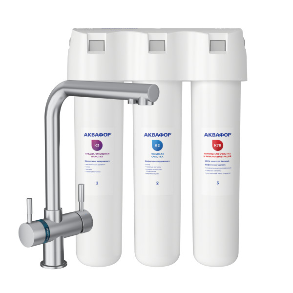 Обратноосмотические фильтры используются для абсолютной защиты от накипи, т.к. полностью устраняют соли жесткости из воды.нетЧисло ступеней очисткиКартриджи последовательно очищают воду и от видимых примесей, и от растворенных. Первый картридж задерживает более крупные частицы, а каждый последующий - более мелкие. Чем больше ступеней - тем лучше фильтр очистит воду: поймает более мелкие видимые частицы ржавчины, песка и ила, успеет захватить из воды максимум растворенных примесей - хлора, нитратов, тяжелых металлов и других.4МинерализацияПроисходит после финишной очистки воды. Необходима прежде всего в фильтре обратного осмоса, поскольку такой фильтр полностью устраняет из воды все примеси, в том числе минералы. Минералы добавляются в оптимальной концентрации - для пользы и привычного вкуса воды.нетПостфильтрацияФинальный этап очистки воды: картриджи постфильтрации удаляют самые мелкие механические частицы и кондиционируют воду, придавая ей более приятный вкус.нетНакопительная емкостьОбычно нужна в фильтрах обратного осмоса. Глубокая фильтрация требует времени. Чтобы Вам не приходилось ждать, пока вода наберется в чайник или кастрюлю, почти во всех моделях используется накопительный бак для чистой воды или другая емкость. В стандартном фильтре обратного осмоса под мойку воды в баке достаточно для семьи из 5-6 человек.нетФильтрующий модуль в комплектедаОтдельный крандаДавление в водопроводе не более, атмМаксимальное давление воды на входе в систему, при котором возможна стабильная работа фильтра.6,5Ширина, смОбратите внимание на габариты фильтра, и измерьте, сколько свободного пространства в предполагаемом месте установки.26,0Глубина, смОбратите внимание на габариты фильтра, и измерьте, сколько свободного пространства в предполагаемом месте установки.9,0Защита корпуса от гидроударовдаИсходная водаЖесткая вода – вода с избытком минеральных солей. От нее появляется накипь в чайнике, известковый налет на сантехнике и разводы на посуде. Мягкая вода – та, в которой мало минеральных солей. Нет накипи в чайнике и разводов на посуде. Фильтры для мутной воды и фильтры от ржавчины, как правило, имеют несколько стадий очистки и дополнительный полипропиленовый картридж. Он задерживает механические частицы ила, песка и ржавчины и защищает картриджи более глубокой очистки.мягкаяУстраняет мутностьМутность водопроводной воды может говорить о том, что в ней много мелких механических частиц. Важно, чтобы в фильтре был установлен дополнительные картридж механической предфильтрации (полипропиленовый) - он продлит жизнь остальным картриджам более тонкой очистки.даУстраняет ржавчину, бурый осадокЛюбой фильтр под мойку удалит из воды крупные и мелкие частицы ржавчины. Некоторые фильтры имеют повышенный ресурс по железу: они дольше служат в такой воде, поскольку лучше подходят для удаления из воды железа и механических частиц ржавчины.даЗащита от бактерийВсе проточные фильтры в той или иной степени защищают от бактерий. Например, добавление серебра препятствует их размножению. Это стандартная степень защиты. Если в семье есть дети, пожилые люди или аллергики, воду рекомендуется обеззараживать, то есть полностью удалять микроорганизмы. Повышенную защиту от бактерий дают фильтры с половолоконной мембраной. Это пучок трубо